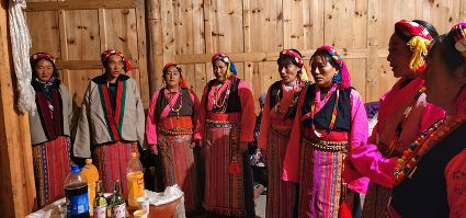 夜臨了,月低垂,整條山谷陷入了藍(lán)色的世界,近處是墨綠,遠(yuǎn)處是淡綠,雄渾的大山在綠的撫摸下也變得婀娜起來;古老寨子的火塘也燃起來了,勞作了一天的普米人聚在一起,跳起了原始氏族人群圍火而舞的傳統(tǒng)舞蹈,曲調(diào)悠揚(yáng)且古樸動人。