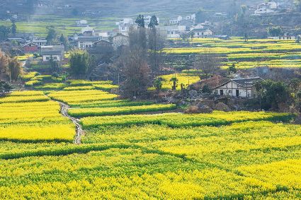 在丹巴,藏寨里滿樹的梨花被春風(fēng)喚醒,雪白的花朵綴滿枝頭;在瀘定,油菜花盛放,翠綠搭配金黃,輕快明亮。