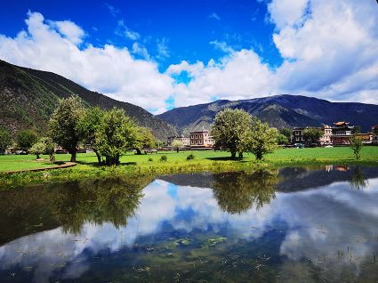 夏日,暖陽(yáng)溫柔,沿途入眼皆是綠意。聽(tīng)說(shuō),俄色花盛放的時(shí)候,潔白的花成簇成團(tuán),一樹(shù)樹(shù)漫山遍野,像九天的云朵堆滿山谷田野,汽車從公路疾馳,風(fēng)里都是俄色的清香。我們來(lái)的時(shí)候稍微遲了,錯(cuò)過(guò)了俄色的花期,花開(kāi)荼蘼,殘花在蒼翠的枝葉里躲藏,風(fēng)里是飛舞的花瓣,紛紛揚(yáng)揚(yáng),在棕紅的棧道鋪成白色的云錦,樹(shù)下是芬芳的余味。棧道邊,金黃的雪白的野花鋪灑在翠綠的草甸上,像濃烈的水彩。地里的青稞,綠得晃人眼睛,綿延的是木雅人勤勞與希望。遠(yuǎn)處,木雅民居在各種深綠淺綠的陪襯下更加的濃墨重彩。