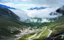 瀘定縣雅家埂,通往海螺溝景區(qū)的道路彎彎曲曲盤旋在山間。