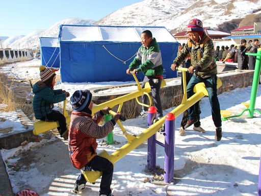 陽光普照在江巴村活動中心,積雪還未完全融化,室外仍然寒氣逼人。6歲的卓呷同伙伴們一邊在活動室外玩健身器材,一邊等待哥哥姐姐們的文藝演出。