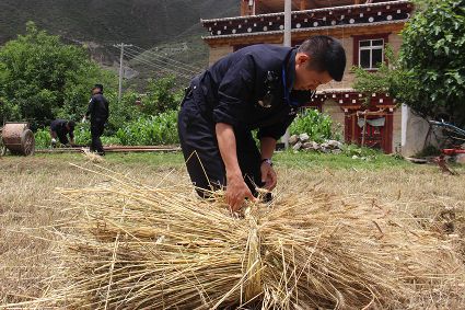 “不能讓鄧珠家成熟了的小麥爛在地里。”近期,巴塘縣陰雨天氣給當?shù)卮迕袷崭钚←湈聿槐?。該縣夏邛派出所民警自發(fā)來到夏邛鎮(zhèn)河西村特困戶鄧珠家田地,以最快的速度幫助收割、捆綁、脫粒等一系列搶收工作。據(jù)悉,夏邛派出所民警在開展“一標三實”工作時,將當?shù)乩щy戶、殘疾戶、五保戶等缺少勞動力的家庭銘記在心,每逢播種秋收都會進行幫助。