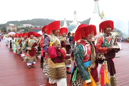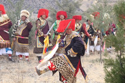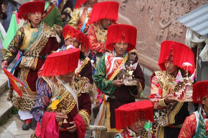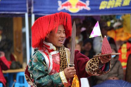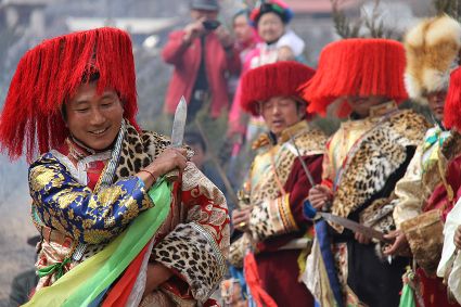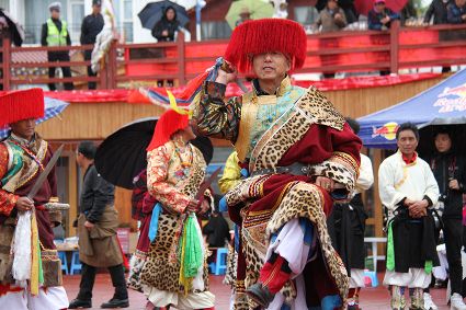 除了歌舞文化,德欽還是民俗文化最大的平臺,神山祭祀是村村寨寨必不可少的活動,在德欽,藏民對山水自然賦予了靈性,認為自然也是和人一樣有著生命和靈性,尊重自然演繹出神山祭祀活動豐富多彩。“刀贊” 藏語稱“百諧”。在德欽農(nóng)村,刀贊是祭祀活動的重頭戲,這一天,不亞于一個盛大的服飾表演。相傳“百諧”是古時村民為消除戰(zhàn)亂,祈福平安的一項傳統(tǒng)祭祀活動,延續(xù)至今已經(jīng)成為一項傳統(tǒng)的民俗活動。“百諧”既是祭祀活動的一個儀式,也是一個獨立的傳統(tǒng)民俗活動,村里每戶一男丁在這一天必須參加“百諧”。“蘇夏”是村里男人戴的最為隆重的帽子,他不同于金邊帽和狐皮帽。長刀是“刀贊”的道具, “吉祥的日子里,我們一敬天地,賜給我們帶來幸福的生活;再敬尊敬的共產(chǎn)黨,為我們帶來平安吉祥;三敬慈祥的雙親,教會我們?nèi)绾巫鲆粋€好人……”朗朗上口的說詞伴著閃閃的刀光起舞,頗具康巴壯士的英武陽剛。