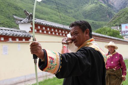 射箭也是德欽以及周邊些村落的重要民俗活動之一,村里的男人們盛裝出場,在射箭場彎弓搭箭,從7、8歲小孩到50多歲的老人都要參加射箭,甭管你射得中靶子與否,笑聲里充滿了和諧和喜慶。德欽縣的江坡村,在每年桃花盛開的季節(jié),都要開展盛大的射箭節(jié),全縣的射箭愛好者都前來一顯身手,康巴漢子們不僅射得一手好箭,還得會拉弦子,悠揚的弦子聲可以給射手們加不少分,活動的初衷就是要求藏族男人必須能文能武。弦子聲聲,唱出了藏家百姓美好的生活,村里的女人戴上了各種金銀首飾,男人們手拉弦子,盡情歡暢的唱著、跳著,村里的老人們是忠實的觀眾,看著大家在舞場里的步子,他們也跟著笑得合不攏嘴,有些年輕人還不時跑出舞場到場邊的老人們面前請教弦子的唱詞,老人們總是不厭其煩的傾囊相授,因為他們曾經(jīng)也是弦子舞場的“明星”。