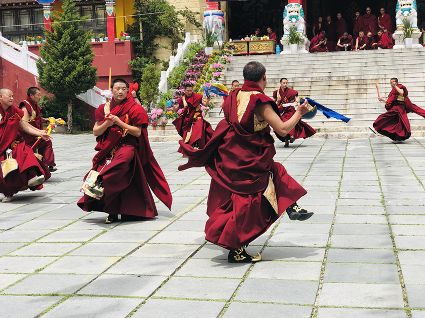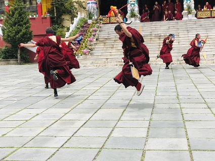 跳神儀式開始,南無寺內(nèi)鼓號(hào)齊鳴,喇嘛身著顯耀盛裝,點(diǎn)燃新綠松枝,幾縷藍(lán)色煙紋升起。一支由法鼓、鈸、海螺、法號(hào)等組成的寺廟樂隊(duì)自大殿而出,順時(shí)針繞場(chǎng)一周落座場(chǎng)邊,群神出場(chǎng)繞圈而舞,以示凈化場(chǎng)地,祈請(qǐng)諸神入位。接著,象征護(hù)法神舞、骷髏舞、鹿神舞、黑帽咒師舞和金剛力士舞的演員手持各類法器挨個(gè)入場(chǎng)手舞足蹈。舞蹈的起落根 據(jù)場(chǎng)邊奏響的器樂節(jié)奏進(jìn)行。最后由眾神驅(qū)鬼逐邪,押送“朵馬”(由糌粑捏成用以供神施鬼的食品)至寺外拋丟焚燒,以示驅(qū)逐一年的邪魔,祈禱來年安樂。