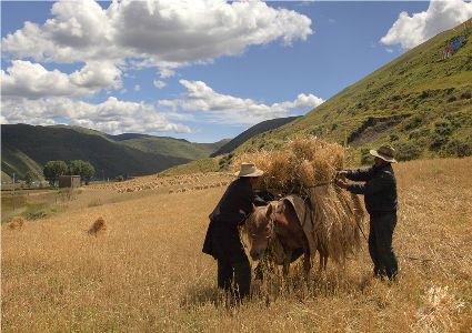 八月起迄,當你翻越西出爐關(guān)第一隘口的折多山,下山十里就會看到山地田野里成熟的青稞、麥子象展開一頁頁金黃的詩篇涌進眼里。那大地山坡起伏驛動的金箔等待著走進主人的碉樓……這個時候,正是秋收的開始。