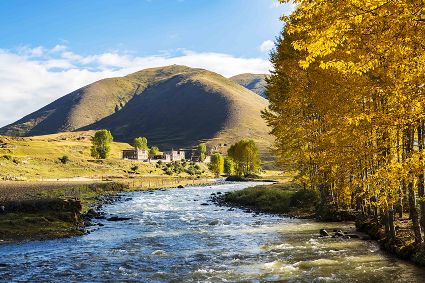 光影如此柔和,秋色如此美麗。夏去秋來(lái),綠草不再成為主調(diào)。紅色、褐色和黃色充斥在眼底,五彩斑斕盡顯秋色,就像油畫(huà)一樣美輪美奐。再加上碧綠清澈的河流,彎彎曲曲,流淌走過(guò)四季,和著暖陽(yáng)牛馬悠閑懶散的身影,自然天成的美景令人心曠神怡、如醉如癡……