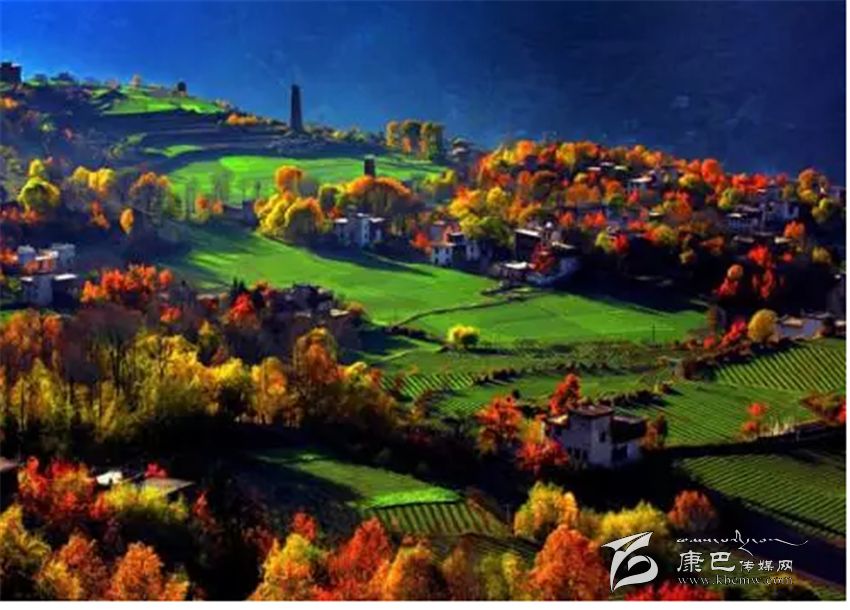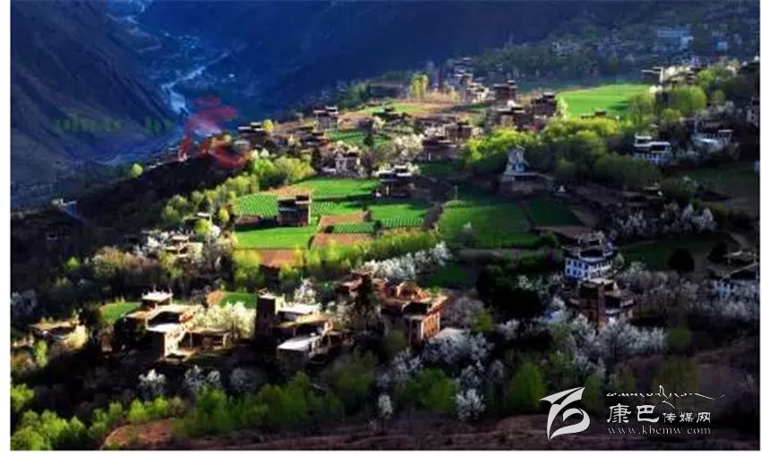 位于四川省甘孜州丹巴縣東北部,白色的藏房、金頂?shù)乃聫R還有歷史悠久的古碉樓在透藍的天空下隱約可見,猶如置身于桃花源之中。