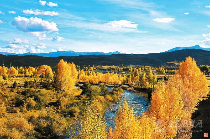 本網(wǎng)訊 10月7日,隨著深秋的到來,位于川西高原藏區(qū)的理塘縣甲洼鎮(zhèn)成片白楊樹由綠變黃,藍(lán)藍(lán)的天空、寧靜的藏寨,構(gòu)成了一幅美麗鄉(xiāng)村畫卷。