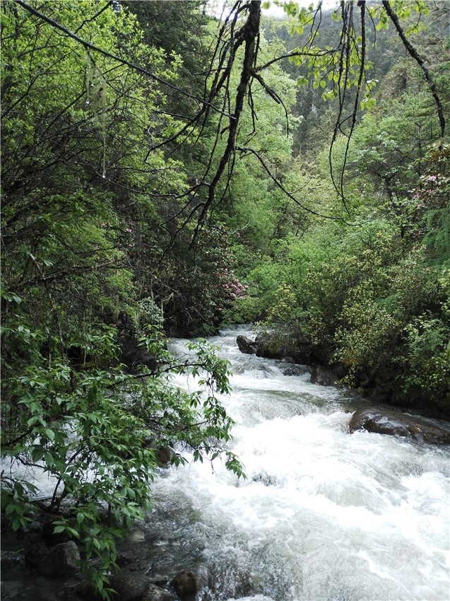 杜鵑花!又有美女的驚叫把我們的視線拉到了另一個(gè)方向,也即我們左手山坡上,一大片姹紫嫣紅的杜鵑花正灼灼綻放于郁郁蔥蔥的林木之間。而這時(shí)也就發(fā)現(xiàn)了,左手邊其實(shí)是一片花的海洋,各類不知名的花朵競相爭艷,把拉角溝初晴的時(shí)空打扮得格外妖艷。于是眾人紛紛拿出手機(jī)兼相機(jī),將這難得一見的景致拍攝下來,而這一過程中,美女們總忘不了騷首弄姿地把自己擺進(jìn)畫面之中,雖然這些美女都是妖婆級的美女了。至于男士,多數(shù)則呵呵笑著看著,頗有閑庭信步、云卷云舒之意。