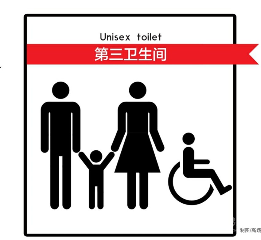 值得一提的是,四川的第三衛(wèi)生間還將有標(biāo)示。《通知》顯示,該標(biāo)示上畫著一對夫妻牽著孩子,旁邊還有一個坐著輪椅的行動不便者。在畫面下方,注明了“第三衛(wèi)生間”字樣,英文“Unisex toilet”意為“無性別廁所”。 (據(jù)四川在線)