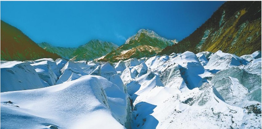 這里有著舉世無(wú)雙的大冰瀑布,在冰川的運(yùn)動(dòng)中,形成晶瑩如翡翠、水晶的冰川弧拱、冰洞、冰階梯、冰門、冰湖、冰峰。