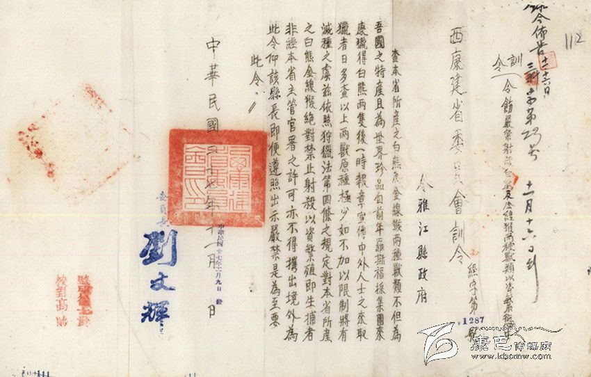 民國(guó)27年(公元1938年),“西康省建省委員會(huì)”發(fā)出“經(jīng)字第1287號(hào)”訓(xùn)令,這是一份難能可貴的保護(hù)野生動(dòng)物的訓(xùn)令,訓(xùn)令說(shuō):“查本省所產(chǎn)之白熊及金線猴兩種獸類(lèi),不但為吾國(guó)之特產(chǎn),且為世界珍品。自前年羅斯福采集團(tuán)來(lái)康獵得白熊兩只后,一時(shí)報(bào)章宣傳,中外人士之來(lái)取獵者日多。查以上兩獸原種極少,如不加以限制,將有滅種之虞。茲依照狩獵法第四條之規(guī)定,對(duì)本省所產(chǎn)之白熊、金線猴絕對(duì)禁止射殺,以資繁殖。即生捕者非經(jīng)本省主管官署之許可,不得帶出境外。為此令仰該縣長(zhǎng)即便遵照出示嚴(yán)禁是為至要,此令。”訓(xùn)令最后署有“西康建省委員會(huì)委員長(zhǎng)劉文輝”的簽名。
