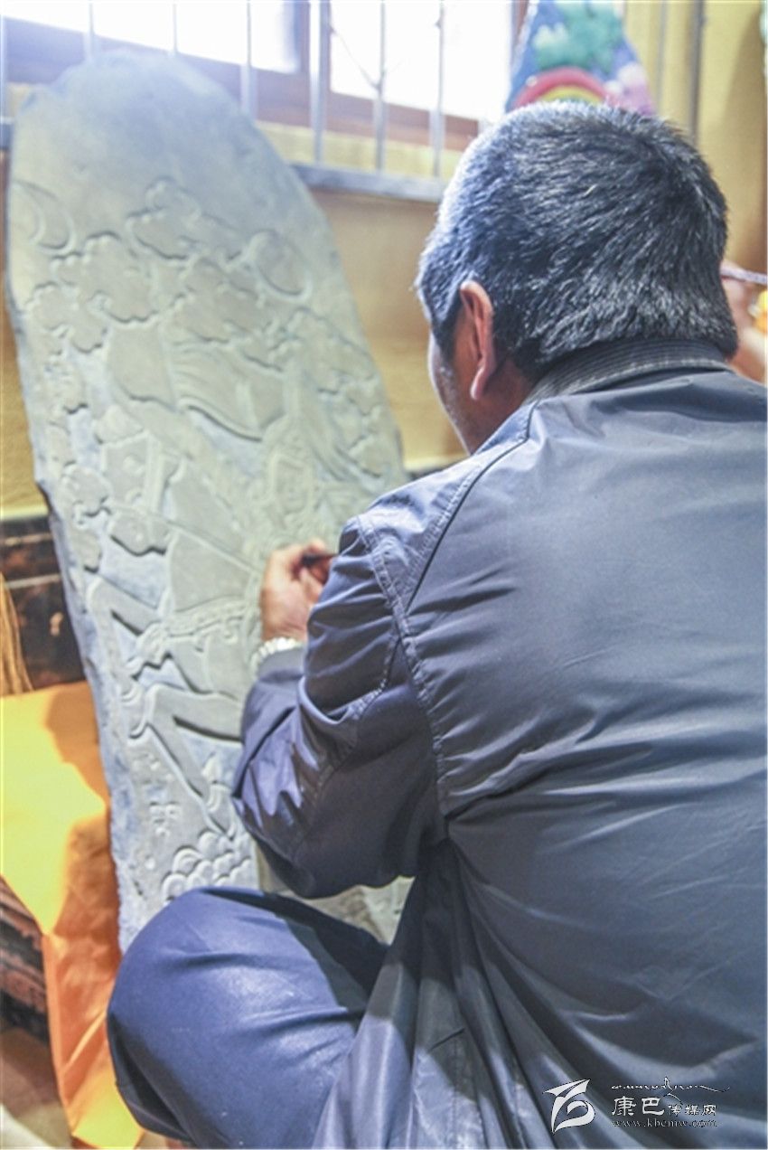 所彭告訴記者,剛開(kāi)始學(xué)習(xí)石刻技藝時(shí),就是刻一些“六字真言”之類的作品。經(jīng)歷了五、六年的磨礪后,就開(kāi)始在土登老人的指點(diǎn)下,刻一些簡(jiǎn)單的佛像作品。土登老人辭世后,所彭便擔(dān)負(fù)起傳承老人技藝的重任。從參軍再到退伍,直到今天,彩繪石刻仍然是所彭的最愛(ài)。他說(shuō),雖然自己不是非遺傳承人,但這并不重要。重要的是,他喜歡這門技藝,也樂(lè)意為格薩爾彩繪石刻傳承做些力所能及的事情。所彭說(shuō),他最遺憾的是自己的孩子中沒(méi)有一個(gè)人學(xué)習(xí)石刻技藝。但他堅(jiān)信,經(jīng)過(guò)發(fā)掘和保護(hù),會(huì)有越來(lái)越多的人行走在格薩爾彩繪石刻的傳承路上。