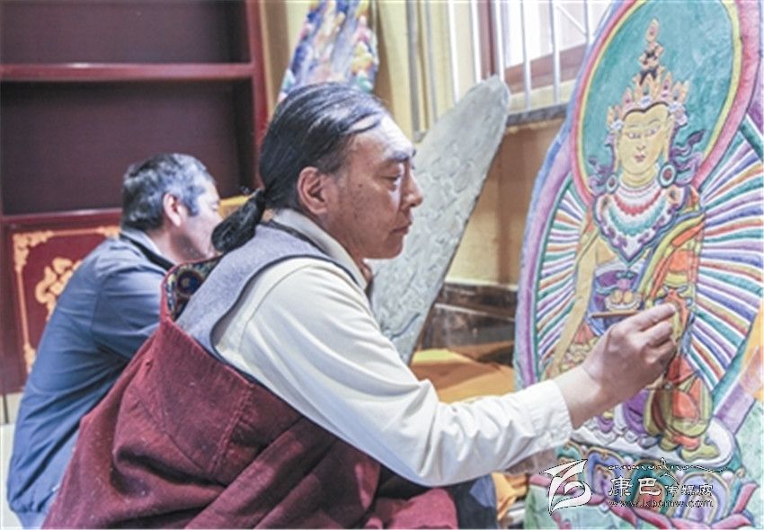 從子承父業(yè)再到吸眾家之長(zhǎng),自離開(kāi)故鄉(xiāng)的那天起,巴德的視野開(kāi)始變得開(kāi)闊起來(lái)。1979年到省藏校學(xué)習(xí)藏文和美術(shù),并開(kāi)始涉獵泥塑技藝,隨后又向德格民間藝人扎西澤郎學(xué)習(xí)彩繪石刻,然后又到西藏、甘肅等地學(xué)習(xí)繪畫、石刻技藝。巴德說(shuō),自己之所以有今天的藝術(shù)造詣,是因?yàn)橛幸慌麕熤更c(diǎn),是因?yàn)樽约旱牟粩嗵剿骱烷L(zhǎng)期堅(jiān)守。讓他欣慰的是,自己的三個(gè)兒子都在學(xué)習(xí)石刻和繪畫,親戚朋友中的十多個(gè)孩子也成了他的入門弟子。