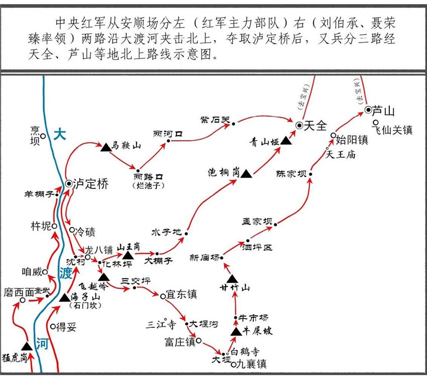 關(guān)于紅軍離開瀘定后的具體行軍路線,聶榮臻同志后來曾經(jīng)回憶:“我全軍過大渡河后,開始想回過頭來,南向清溪、富林,以扼阻中央軍渡河北上,所以我們1軍團又在化林坪等地擊潰退守第二線的四川軍閥河防部隊。以后軍委得知清溪有川軍守敵四個旅,為了避免與敵糾纏,盡快與四方面軍靠攏。又命令我們繼續(xù)北上去占領(lǐng)天全、蘆山。”5月31日,飛奪瀘定橋的紅2師4團不顧連日行軍作戰(zhàn)的疲勞,從瀘定趕到飛越嶺下,攻打飛越嶺。飛越嶺位于瀘定縣東南,是漢源和瀘定的分界地,海拔近3000米。山頂有一隘口,稱為飛越關(guān)。此關(guān)是瀘定能往漢源、滎經(jīng)的道路,也是紅軍北上的必經(jīng)之地。6月1日清晨,紅軍發(fā)起對飛越關(guān)敵軍陣地的偷襲戰(zhàn),在付出30余人傷亡的代價后,成功占領(lǐng)了飛越關(guān)。