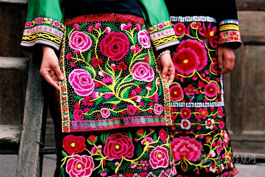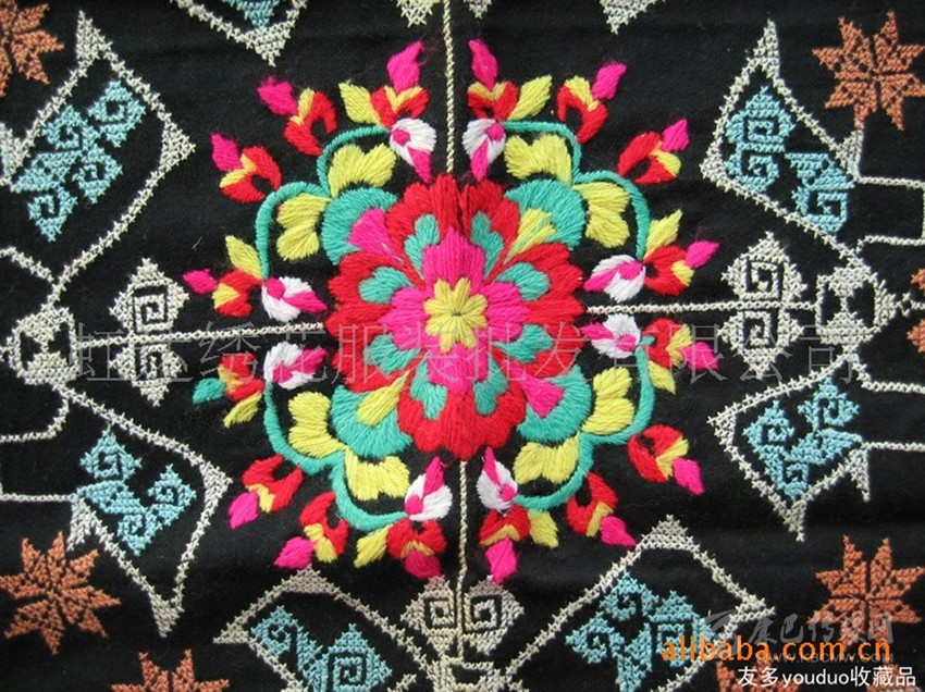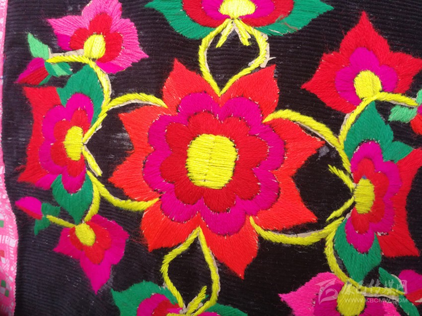 在這里,婦女們猶愛花草。所以,他們的刺繡作品,有生活的細(xì)節(jié)滲透,如氣息,若有似無(wú),相互浸潤(rùn)。無(wú)論是花蔓纏枝,還是朵花團(tuán)簇,都從生活中提煉,視之便信手拈來(lái),放在青布黑衫之上,鮮艷奪目,張顯著生活在這方水土之上,人們獨(dú)特的審美情趣。
