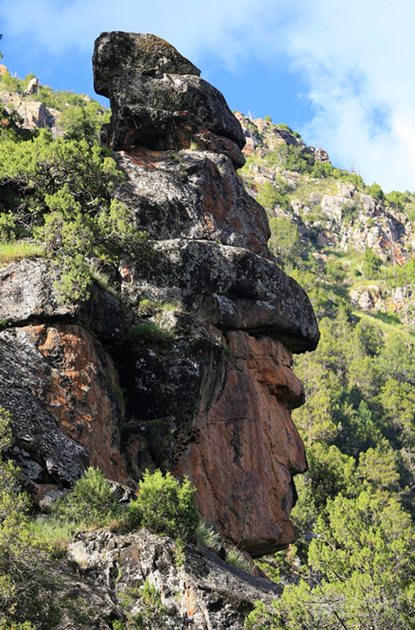 從多爾家溝口走7公里到日貢多時,在右側的山巖上發(fā)現(xiàn)了一處自然形成的人頭像。耳、眉、眼、口、鼻五官形象逼真,還穿戴著帽子和盔甲,第一眼看見就不禁聯(lián)想到格薩爾藏戲面具和格薩爾石刻中的格薩爾王形象。