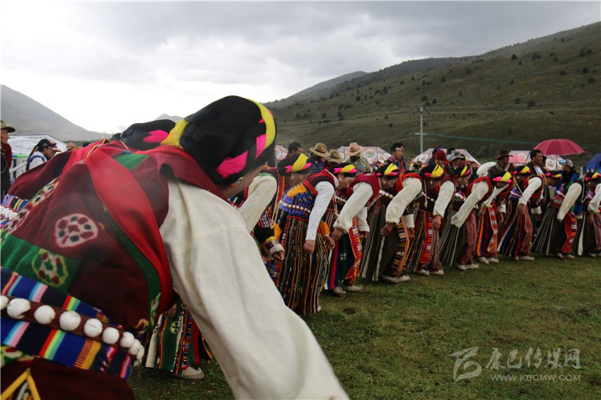 10月2日,在木雅鍋莊悠揚的旋律和輕盈的舞步中,歷時兩天的“2017康定情歌國際音樂節(jié)”盛大開幕,作為“五大民俗展演”中的特色民俗歌舞表演部分,木雅鍋莊吸引了眾多游客的關注。木雅鍋莊來源于木雅人的日常生產(chǎn)和生活,是當?shù)剞r(nóng)耕文化習俗的重要表現(xiàn),表演服飾多以棕紅色外套,紅、白色襯衫為主,表演者多佩戴紅頭繩、珊瑚、金銀等裝飾物。舞蹈分男女兩組,列隊圍桌成圓形,皆彎腰垂首隨領唱歌聲而舞。男組舞姿氣勢豪放,女組舞姿委婉優(yōu)雅。唱腔宛轉(zhuǎn)悠揚,吸引了在場觀眾冒雨駐足觀看,有的甚至情不自禁隨著舞群踏起了舞步,融入到康巴文化的神秘魅力當中。