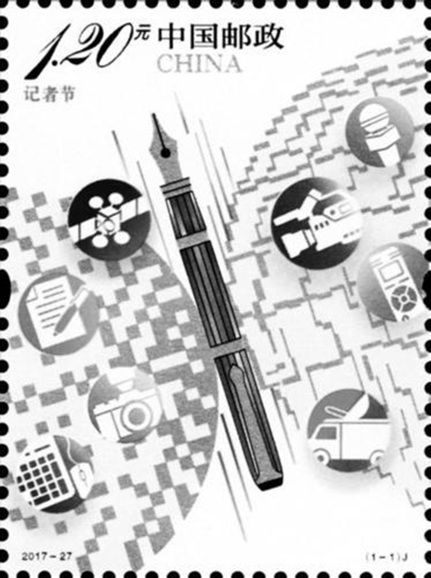 為紀念第18個記者節(jié)。中國郵政定于2017年11月8日發(fā)行《記者節(jié)》紀念郵票一套1枚。郵票圖案采用了具有現(xiàn)代感的構(gòu)成手法及色彩表達方式。畫面中的鋼筆象征了記者秉持弘揚民族精神、維護國家利益和社會責任的專業(yè)精神和自信風范。兩側(cè)的線條及方點構(gòu)成的兩個圓形圖案分別隱喻地球和現(xiàn)代網(wǎng)絡(luò)體系,表示在新媒體時代,新聞傳播媒介所呈現(xiàn)出的多元化、全球化的發(fā)展態(tài)勢。畫面中麥克風、攝像機、錄音筆等形式各異的采編設(shè)備圖標,結(jié)合衛(wèi)星及地面發(fā)射站等元素,突出了當代記者巨大的社會影響力。同時,鋼筆和兩側(cè)的圓形圖案共同組成了一只振翅飛翔的蝴蝶形象,喻意了記者追求至善至美,在探訪報道中擔負著傳播先進文化,引領(lǐng)和維護和諧社會,推動人類文明的崇高使命和社會責任。