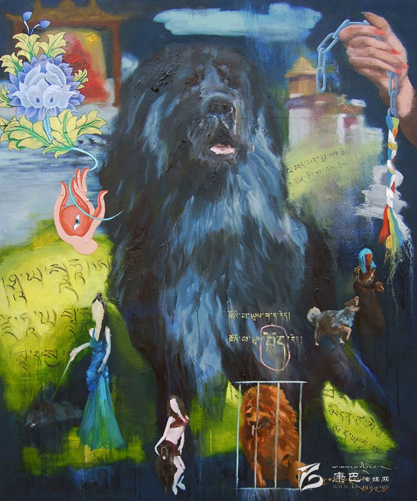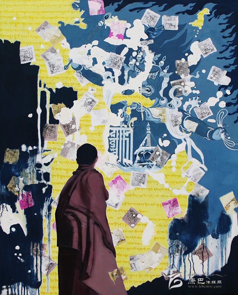 采用藏區(qū)題材做藝術(shù)的藝術(shù)家不在少數(shù),強(qiáng)調(diào)寫實(shí)、原汁原味是大部分藝術(shù)家的選擇,但生于康定的藝術(shù)家周韜卻有另一番更深入的認(rèn)識。與美國印第安藝術(shù)家Brad kahlhamer一樣,他用更加強(qiáng)烈動態(tài)的視覺制造了一個魔幻世界,讓眾人熟悉的藏區(qū)元素在畫面上集中而豐富地跳躍起來,比如喇嘛、活佛、長辮子的藏族女人,甚至形狀怪異的骷髏!