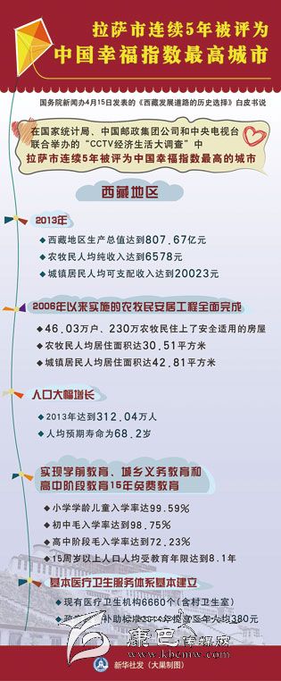 新華社北京4月15日電(記者張曉松、郭麗琨)白皮書說,西藏絕大多數(shù)人口擺脫了延續(xù)上千年的貧困,基本達(dá)到了小康生活水平。在國家統(tǒng)計局、中國郵政集團(tuán)公司和中央電視臺聯(lián)合舉辦的“CCTV經(jīng)濟(jì)生活大調(diào)查”中,拉薩市連續(xù)5年被評為中國幸福指數(shù)最高的城市。