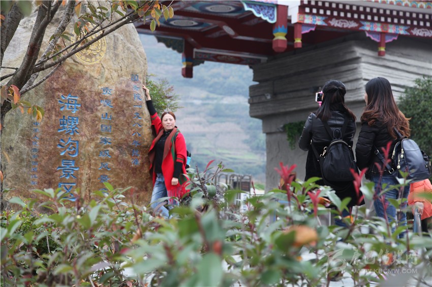 海螺溝可謂處處皆風(fēng)景,圖為游客在海螺溝景區(qū)大門(mén)留影。