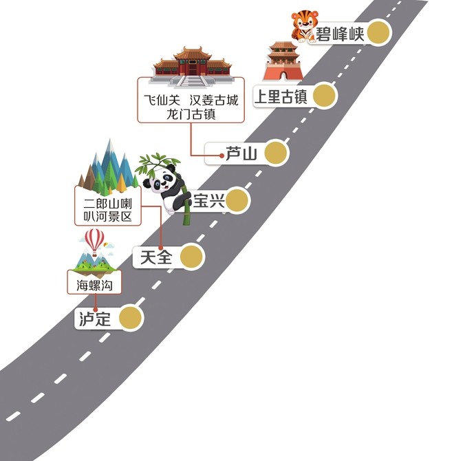 繼續(xù)往前走,車子一路向西,在多功出口下高速,再沿國道351線繼續(xù)前行不久,便是“漢代文物之鄉(xiāng)”蘆山,有飛仙關(guān)、漢姜古城、龍門古鎮(zhèn)3個4A級景區(qū)。如果從蘆山沿國道351線繼續(xù)走,則到了“熊貓老家,傳奇寶興”。