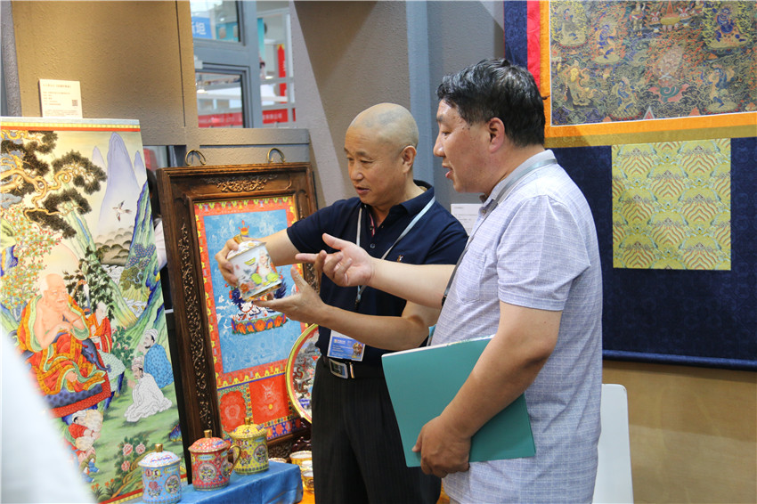 本網(wǎng)訊(記者 宋志勇 文/圖)“我是一次摔壞陶瓷,成就了我和馮建華藝術(shù)合作。”這是參加第十四屆中國(深圳)國際文化產(chǎn)業(yè)博覽交易會上,來自爐霍縣華彩文化傳播有限公司參展商付國華這樣說,而在馮建華心里,雖然這是他的鎮(zhèn)館之寶,但他對付國華這位千里迢迢從甘孜藏區(qū)來到景德鎮(zhèn),感到自豪和高興,于是結(jié)下了深厚的感情,因此完成了唐卡與陶瓷藝術(shù)的完美結(jié)合——高溫粉彩瓷板。