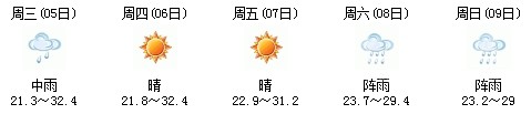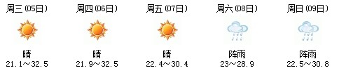 5日白天開(kāi)始一直到9日,以多云天氣為主,其中7日晚有陣雨,日最高氣溫在30度上下,天氣比較舒適,不會(huì)出現(xiàn)高溫天氣,高考和端午節(jié)期間天氣還是比較給力:
