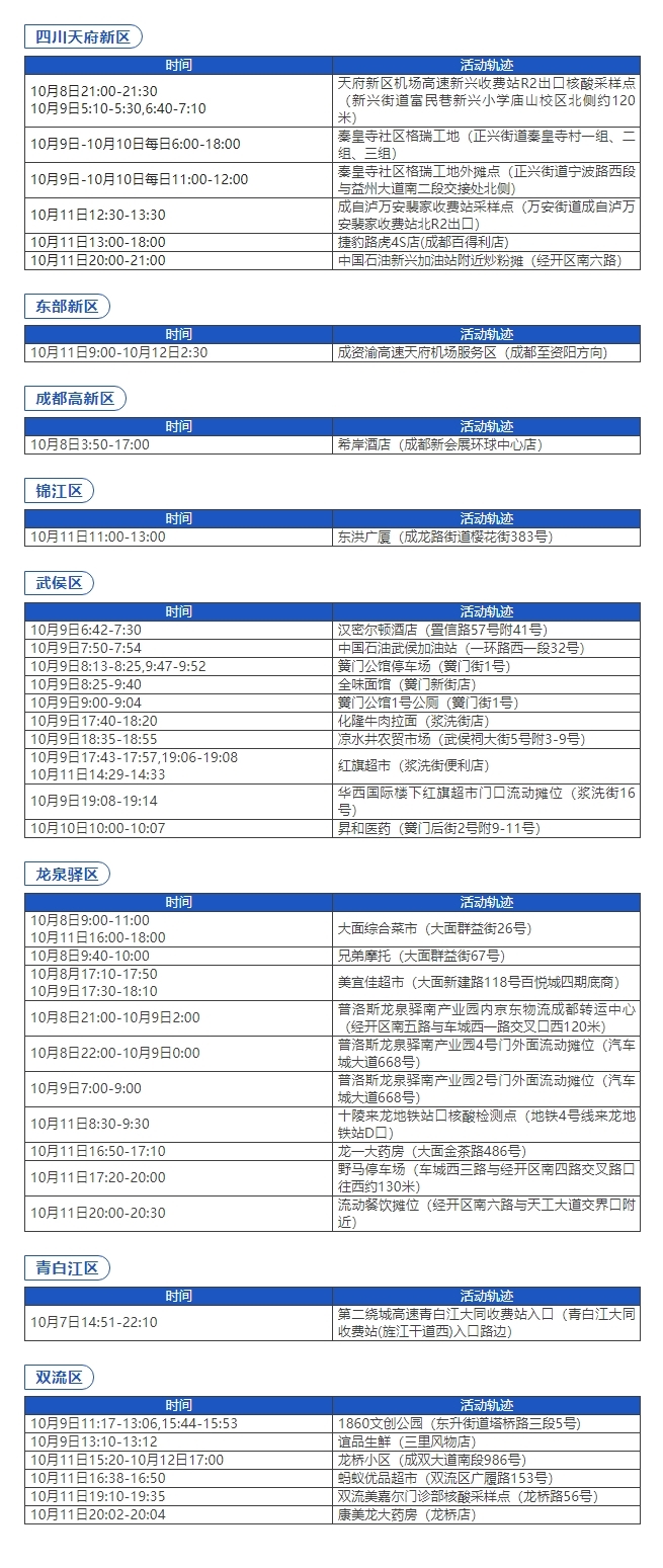 近期新增感染者在蓉軌跡現(xiàn)公布如下,如與以下活動軌跡有重疊,立即向社區(qū)和單位(或居住的酒店)報備,三天內接受三次核酸檢測(間隔24小時),期間做好個人防護,不聚會、不聚餐。如有疑問,請撥打12345咨詢。