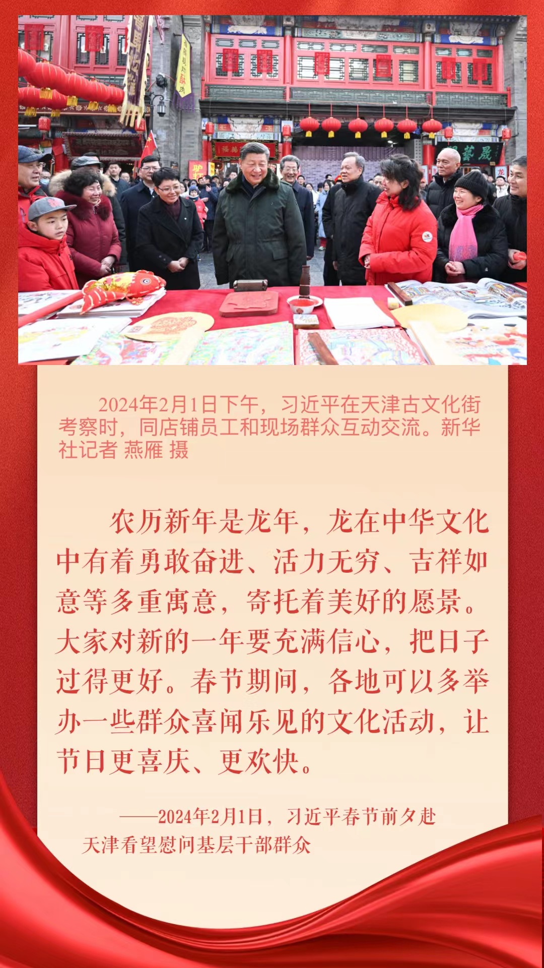 改善人居環(huán)境要保護(hù)歷史文化底蘊(yùn),發(fā)展經(jīng)濟(jì)、服務(wù)百姓的同時(shí),要注意弘揚(yáng)民族文化和傳統(tǒng)文化。黨的十八大以來,習(xí)近平總書記在地方考察調(diào)研時(shí)多次強(qiáng)調(diào),中國式現(xiàn)代化離不開優(yōu)秀傳統(tǒng)文化的繼承和弘揚(yáng),叮囑各地要讓歷史文化和現(xiàn)代生活融為一體,更好弘揚(yáng)中華優(yōu)秀傳統(tǒng)文化,更好服務(wù)經(jīng)濟(jì)社會發(fā)展和人民高品質(zhì)生活。在春節(jié)這個(gè)中華民族傳統(tǒng)節(jié)日,一起來重溫!