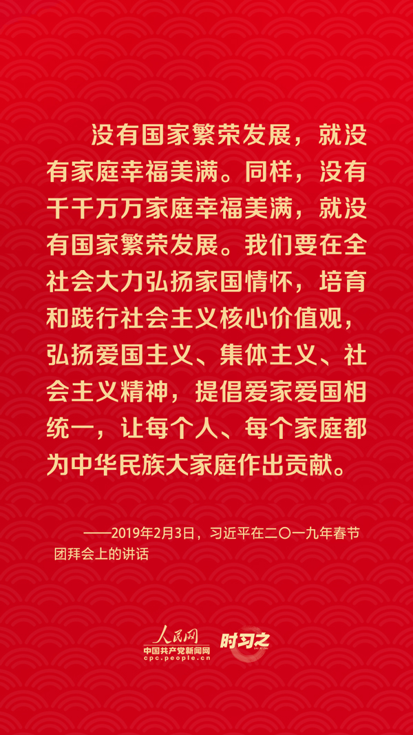 團(tuán)圓是春節(jié)永恒的主題?!皼]有國(guó)家繁榮發(fā)展,就沒有家庭幸福美滿。同樣,沒有千千萬萬家庭幸福美滿,就沒有國(guó)家繁榮發(fā)展?!绷?xí)近平總書記曾在多個(gè)場(chǎng)合深刻闡述家庭與國(guó)家之間的關(guān)系,從他的話語(yǔ)里一起感悟深厚的家國(guó)情懷。