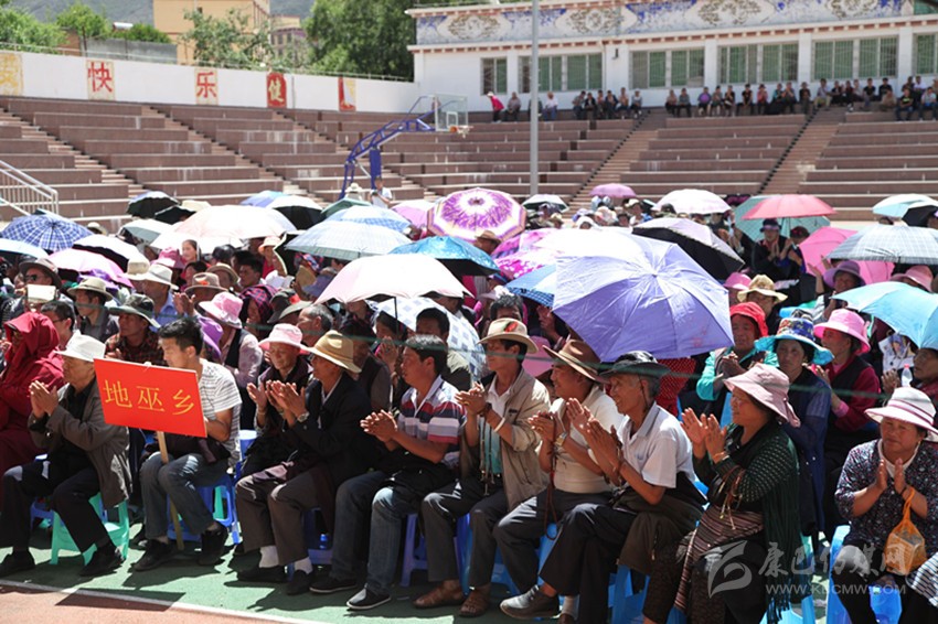 烈日炎炎,然而,比氣溫更高的是群眾的熱度。中午1點(diǎn)過(guò),夏邛鎮(zhèn)、竹巴龍鄉(xiāng)、地巫鄉(xiāng)、康寧寺的機(jī)關(guān)干部、群眾、僧侶們便陸續(xù)走進(jìn)體育中心。