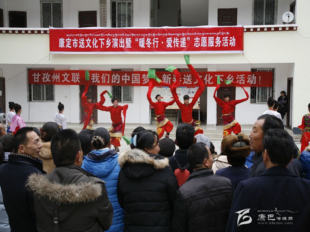 本網訊(本網記者 張兵)1月8日,由州文聯(lián)與康定市聯(lián)合主辦的以“我的中國夢”為主題的2016送文化下鄉(xiāng)文藝演出隊迎著冬陽伴著寒風走進大山深處的金湯鎮(zhèn)。整臺演出節(jié)目新穎、形式多樣,獨唱、歌舞、川劇、政策宣講等節(jié)目精彩紛呈,不時博得觀眾們的熱烈掌聲,鎮(zhèn)政府成了歡樂的海洋。同時,州攝影家協(xié)會、州書法家協(xié)會的專家還現(xiàn)場免費拍攝全家福照片、免費書寫春聯(lián)。“送文化下鄉(xiāng)”演出隊帶去了黨和政府對人民群眾的關懷,同時也營造了文明、健康、歡樂、祥和的節(jié)日氣氛。當天,“送文化下鄉(xiāng)”演出隊不辭辛苦,還在姑咱鎮(zhèn)進行了演出。