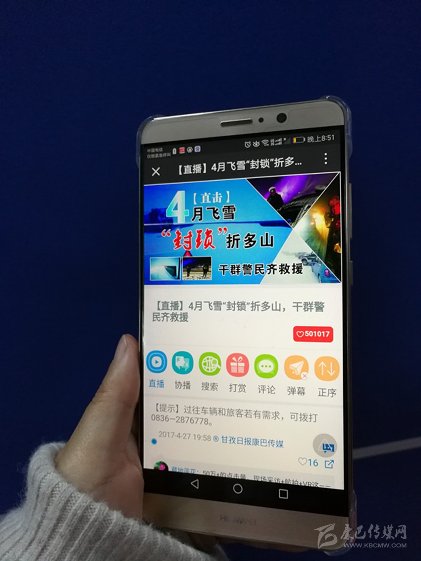 一路上,記者通過甘孜日報微信平臺,將救援情況和群眾的實(shí)況,第一時間進(jìn)行了直播。隨著一條條現(xiàn)場圖片、文字和視頻的及時發(fā)布,人們第一時間得知了折多山受困車輛和群眾得到救助的實(shí)際情況,人們紛紛在直播平臺留言,為交通、路政和當(dāng)?shù)攸h委、政府的救援行動點(diǎn)贊。在對折多山強(qiáng)降雪和受堵現(xiàn)場進(jìn)行直播報道的同時,甘孜日報社還利用直播平臺,回顧了折多山道路交通難的歷史,并再次發(fā)布雅康高速修建、折多山隧道立項(xiàng)等重大交通建設(shè)工程的進(jìn)展情況,又對此次折多山風(fēng)雪阻斷道路交通,導(dǎo)致車輛和人群滯留的特殊原因進(jìn)行了報道和澄清,并報道了風(fēng)雪中仍有不少徒步游客繼續(xù)甘孜之旅的情況,第一時間讓更多的人了解到,飛雪并未對道路造成致命影響,甘孜州的道路交通狀況和應(yīng)急處置能力已經(jīng)得到了極大的提升,完全有能力保障人們出行以及生命、財產(chǎn)安全。