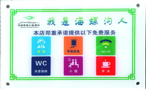 “我們長征大酒店在提高服務質(zhì)量的同時也掛了這個牌子,我們承諾為客人提供免費的開水、充電、共享廁所等服務,讓客人對海螺溝有一個美好的印象,在海螺溝過的開心愉快。”長征大酒店負責人楊德黎說。
