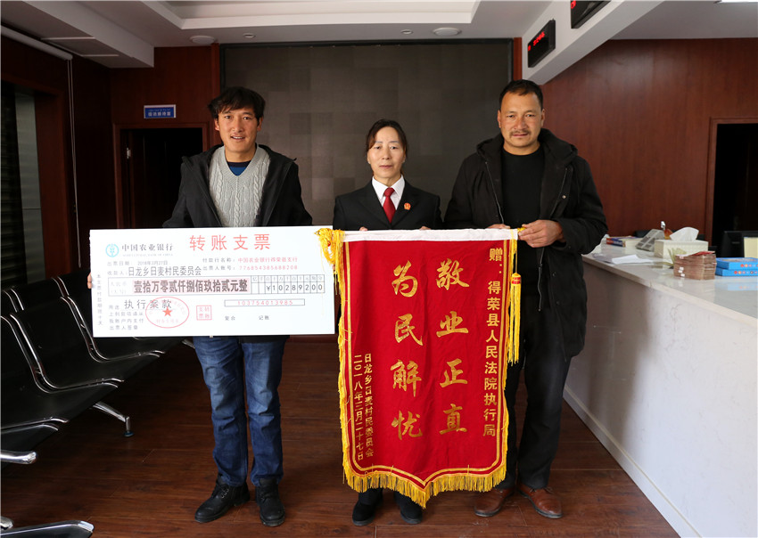 在執(zhí)行款發(fā)放現(xiàn)場(chǎng),得榮法院執(zhí)行局局長(zhǎng)小娜錯(cuò)法官正逐一核對(duì)當(dāng)事人信息,辦理領(lǐng)款手續(xù),她向筆者介紹說(shuō):“去年開(kāi)始,我們?cè)诠矓M定出了29個(gè)基本解決執(zhí)行難的工作任務(wù),形成了7條具體措施,對(duì)所屬的11件執(zhí)行難案每件形成專項(xiàng)行動(dòng)方案,并將‘一案一辦法’的基本原則落實(shí)到了后續(xù)的23件案件執(zhí)行當(dāng)中,取得了良好的執(zhí)行效果,今后我們將持續(xù)深入執(zhí)行難專項(xiàng)行動(dòng),全面深入落實(shí)依法治理,切實(shí)保護(hù)人民群眾的合法權(quán)益,努力讓人民群眾在每一件司法案件中都感受到公平正義,感受到更多的幸福感和安全感?!?/p>